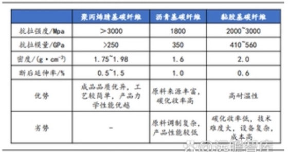 按照原料體系碳纖維主要分為粘膠基、瀝青基和聚丙烯腈(PAN)基三大種類,各有不同的使用場景和生產(chǎn)方法。由于高碳產(chǎn)率和優(yōu)越的性能,PAN基碳纖維占據(jù)了碳纖維市場的主導(dǎo)地位。然而,由于較低純度和較低成本的碳纖維可以滿足汽車行業(yè)等較新的應(yīng)用,對瀝青等前驅(qū)體的需求將增加。