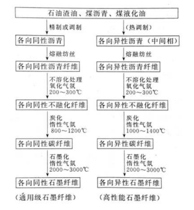 瀝青基碳纖維制備工藝主要包括可紡瀝青的調(diào)制、熔融紡絲、預(yù)氧化、碳化及石墨化四步工序,以下工藝以高性能瀝青基碳纖維為例。